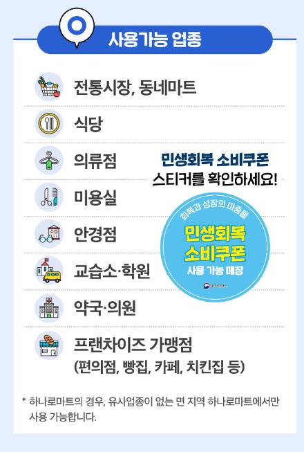 - 가맹점: 지역 자영업자가 직접 운영하는 매장이므로, 연 매출액 30억원 이하의 가맹점에서는 소비쿠폰을 사용할 수 있습니다! 🎉