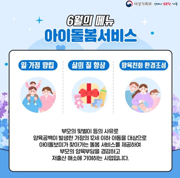 아이돌봄서비스는 맞벌이, 한부모 등 양육 공백이 발생한 가정의 12세 이하 아동을 대상으로 전문 아이돌보미가 가정을 방문해 돌봄을 제공하는 서비스입니다.