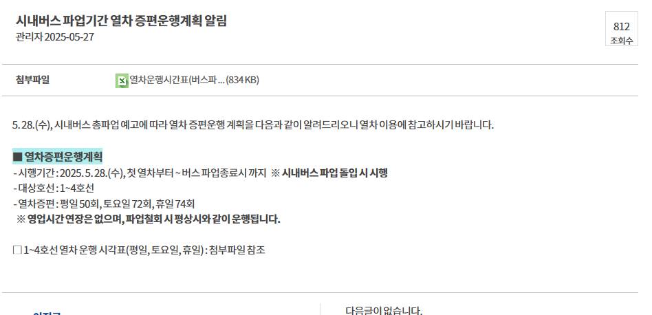 - 파업 당일에는 도시철도 등 대체 교통수단 이용을 권장드립니다.