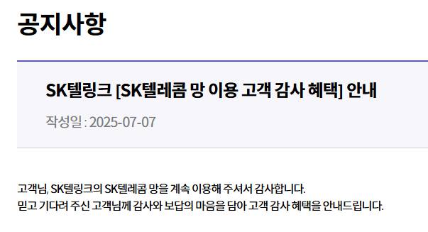 SK텔링크에서는 SK텔레콤 망 이용 고객님들께 감사의 마음을 담아 특별한 혜택을 제공합니다. 2025년 7월 15일 0시 기준으로 가입된 모든 고객님들이 대상이며, 후불과 선불 고객에게 각각 다른 형태의 혜택이 적용됩니다.