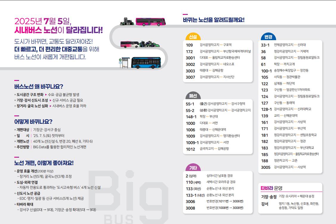 단순한 노선 조정이 아닙니다. 생활의 흐름 자체가 바뀔 수도 있습니다. 이번 개편은 ‘효율성’과 ‘접근성’ 두 마리 토끼를 잡기 위한 부산시의 시도이며, 그 중심엔 시민 여러분이 있습니다.