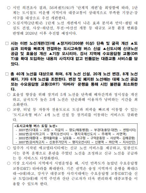 부산시는 2023년 8월부터 12월까지 데이터를 활용한 시내버스 개편 용역을 실시했고, 이후 설명회와 민원 수렴 등을 거쳐 실현 가능한 개편안을 마련했습니다. 단순히 감에 의존한 조정이 아니라 실제 수요와 효율성을 반영했다는 점이 핵심입니다.