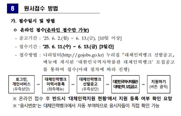 접수 기간은 2025년 6월 11일부터 13일까지. 3일 간만 온라인 접수가 진행되며, 나라일터(gojobs.go.kr)에서 이력서 등록 후 ‘지원하기’를 클릭하세요.
